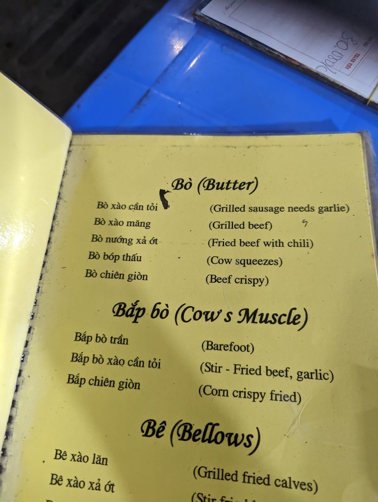 The view outside a wonderful bia hoi. I had a couple, read my book and ate beef. The young lads working there loved football. I told them I wasn’t bothered. This confused them, so I’ll be sure to lie in future. I currently support Newcastle. The menu had some great hardcore/post-post-punk band names.