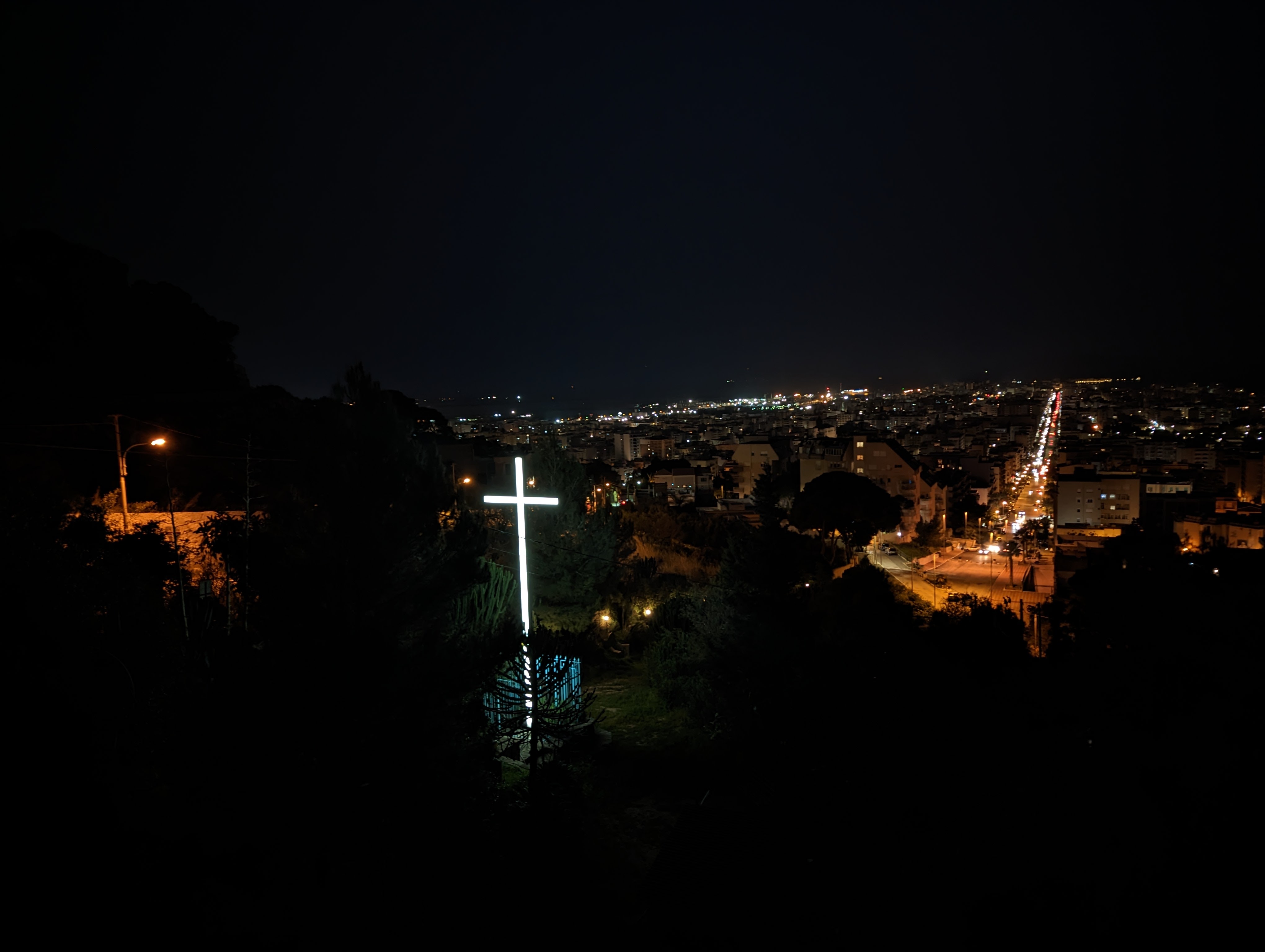 It wasn’t that bad. I’m hamming it up for the craic. I made it to streetlight just in time and, as if the aforementioned Lord and Saviour was genuinely watching out for me like the legend that he is (Praise be, he’s alright really), I was guided to safety by this heavenly beacon. Although, as postulated by Bill Hicks and probably many others, I’m not sure he’d be thrilled at the implement of his destruction being illuminated in such a garish way. It’d piss me off, coming back from two thousand years absence to find crucifixes everywhere, having been nailed to one previosuly. I reckon he’d prefer a big ol’ beer, or a bit of pizza, to welcome him home.